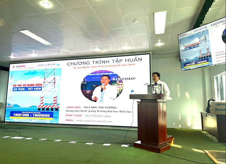 Trong hai ngày 02 - 03/04/2026, tại Hội trường Công ty Điện lực Lâm Đồng – Cơ sở 3, Hội Điện lực miền Nam phối hợp Điện lực Gia Nghĩa tổ chức chương trình tập huấn sử dụng điện an toàn – tiết kiệm năm 2026.